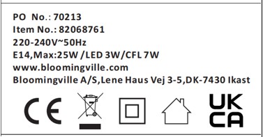 | Bulb wattage | Max. 25W / LED 3W/ CFL 7W |