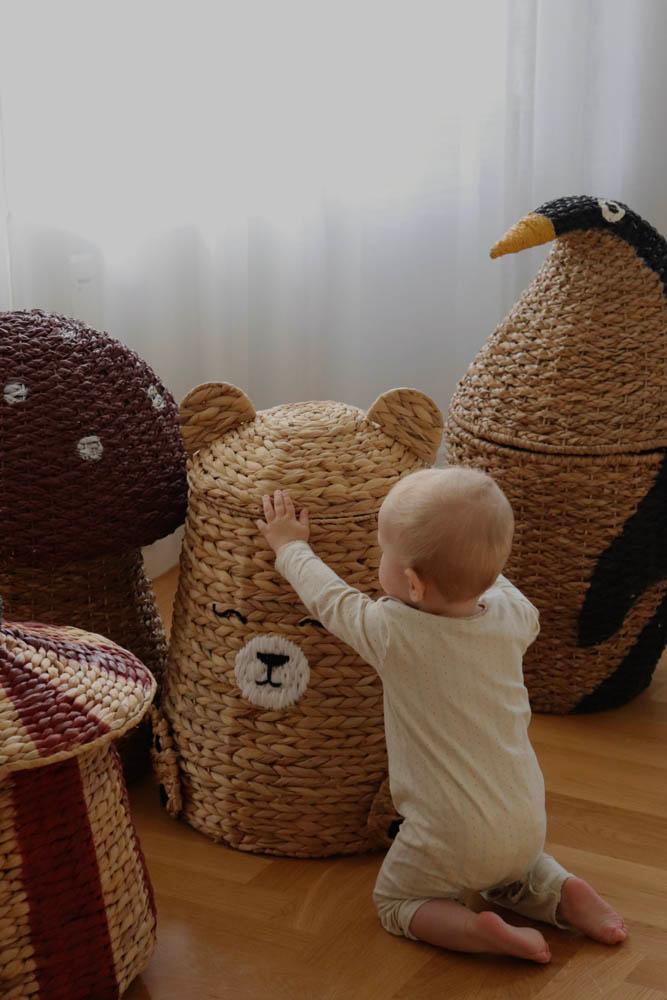 Le Panier Tazia a trouvé sa place dans la cuisine épurée de @wilsholm. Le pingouin caractéristique apporte une expression ludique, tout en dissimulant les jouets et les petits objets.